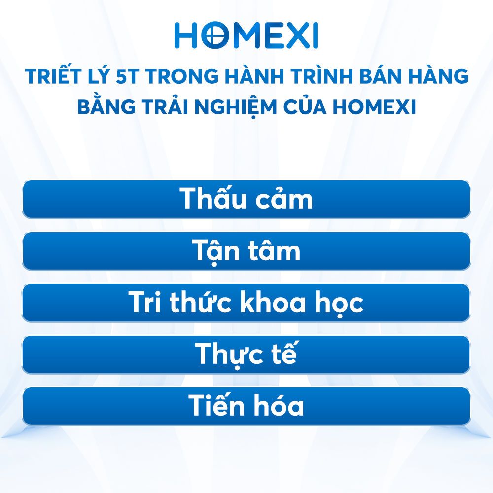 5T – Thấu cảm, Tận tâm, Tri thức, Thực tế, Tiến hóa không chỉ là giá trị nội bộ, mà là cách Homexi vận hành, bán hàng, chăm sóc và đồng hành cùng cộng đồng.