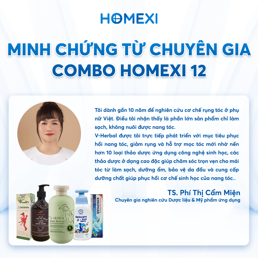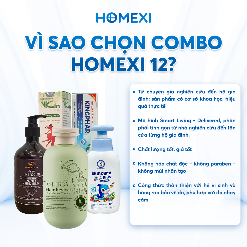 “Nhà mình 3 thế hệ, mỗi người một da một tóc. Nhưng từ khi dùng combo cá nhân Homexi 12, không cần lo chọn lẻ nữa. Từ bé con đến ông bà đều dùng được – Không kích ứng, thơm dịu, tóc khỏe rõ rệt.”